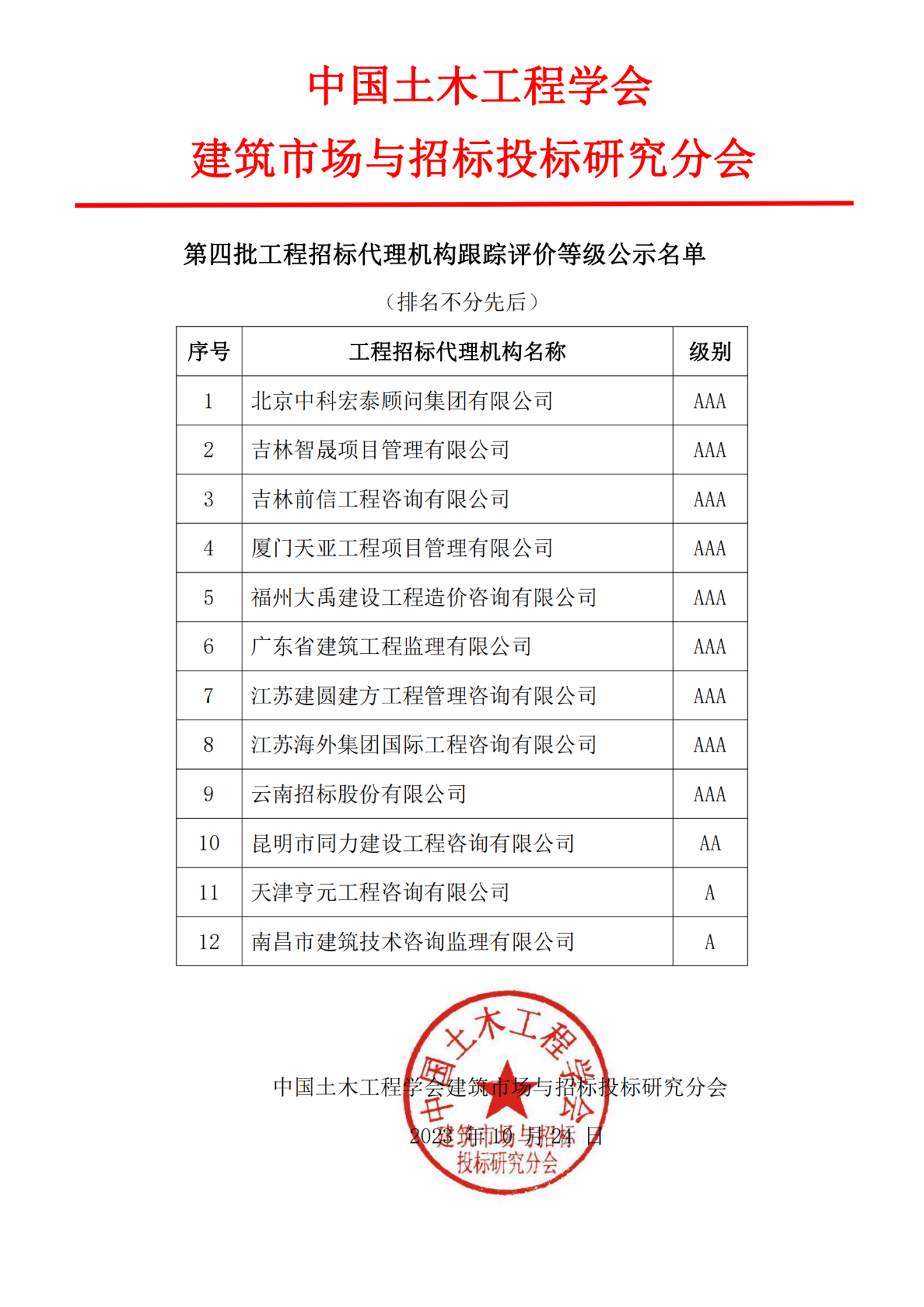 第四批工程招标代理机构跟踪评价等级公示名单
