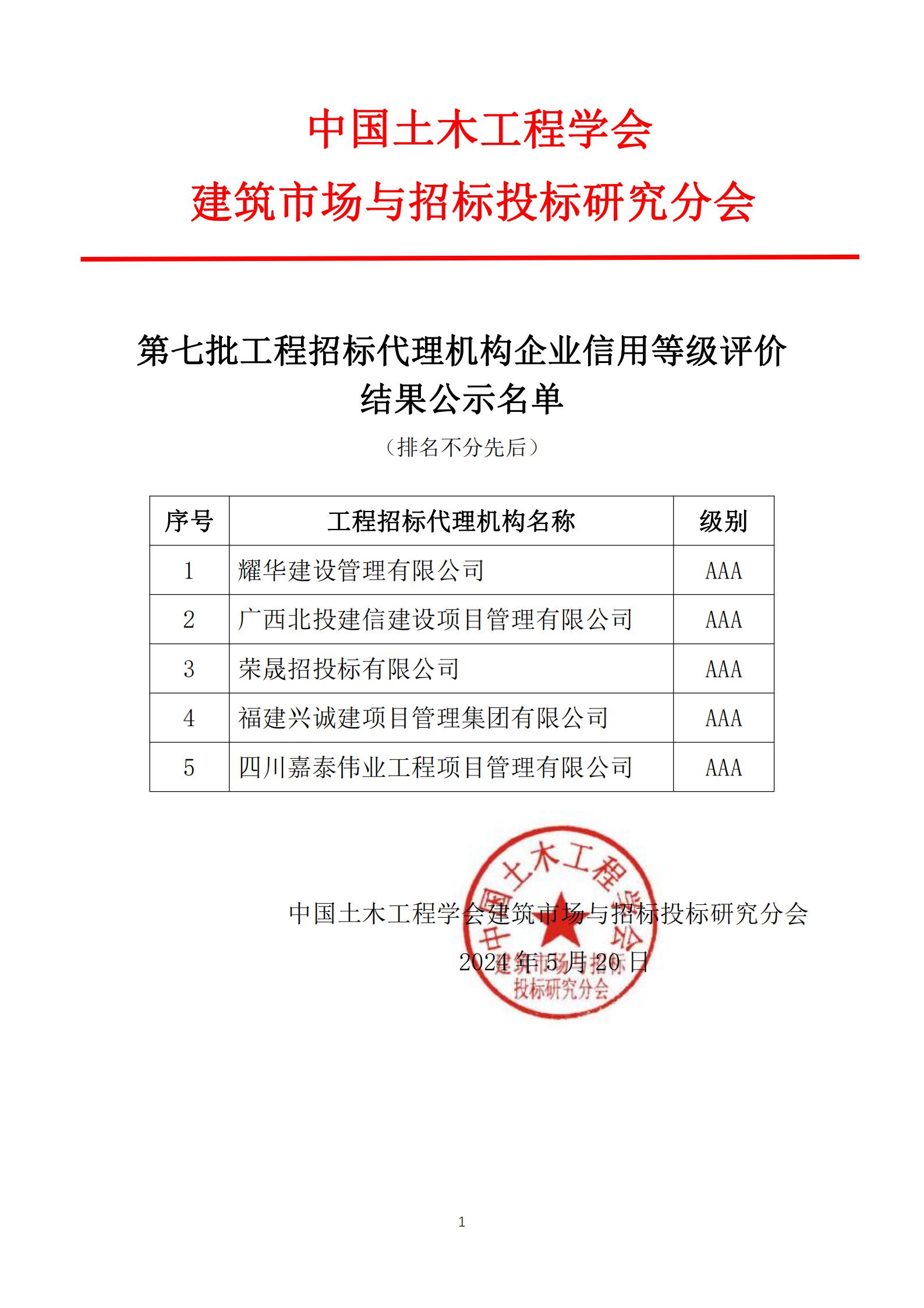 第七批工程招标代理机构企业信用等级评价结果公示名单
