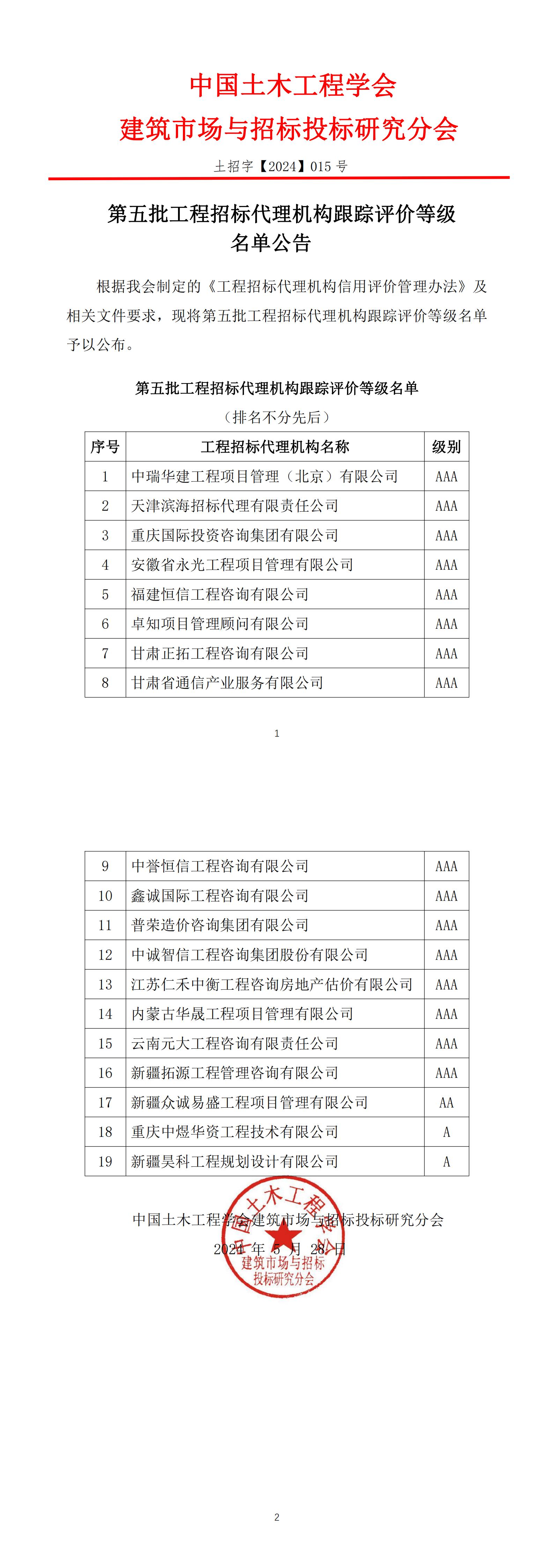 第五批工程招标代理机构跟踪评价等级名单公告
